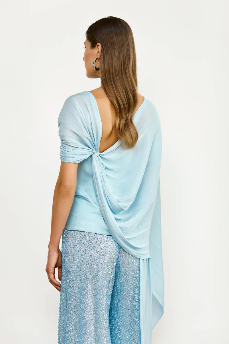 Le pantalon fluide à paillettes apporte une allure glamour, associé au bustier il illumine la tenue avec subtilité. Sa coupe parfaite allonge la silhouette et offre un tombé impeccable. Les paillettes apportent une note festive et raffinée idéale pour une maman de marié qui souhaite briller avec élégance sans excès.