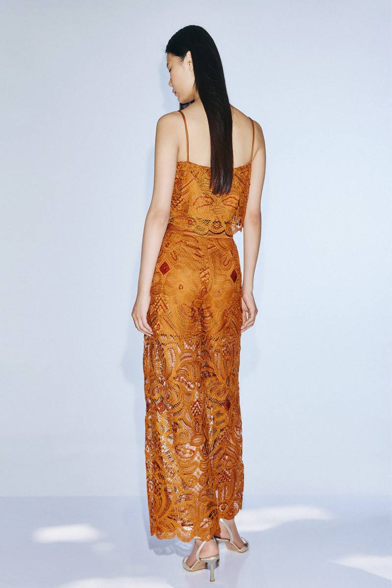 Le top en dentelle perlée est décolleté droit avec de fines bretelles ornées de perles. Ce détail apporte une touche originale et met en valeur les épaules.