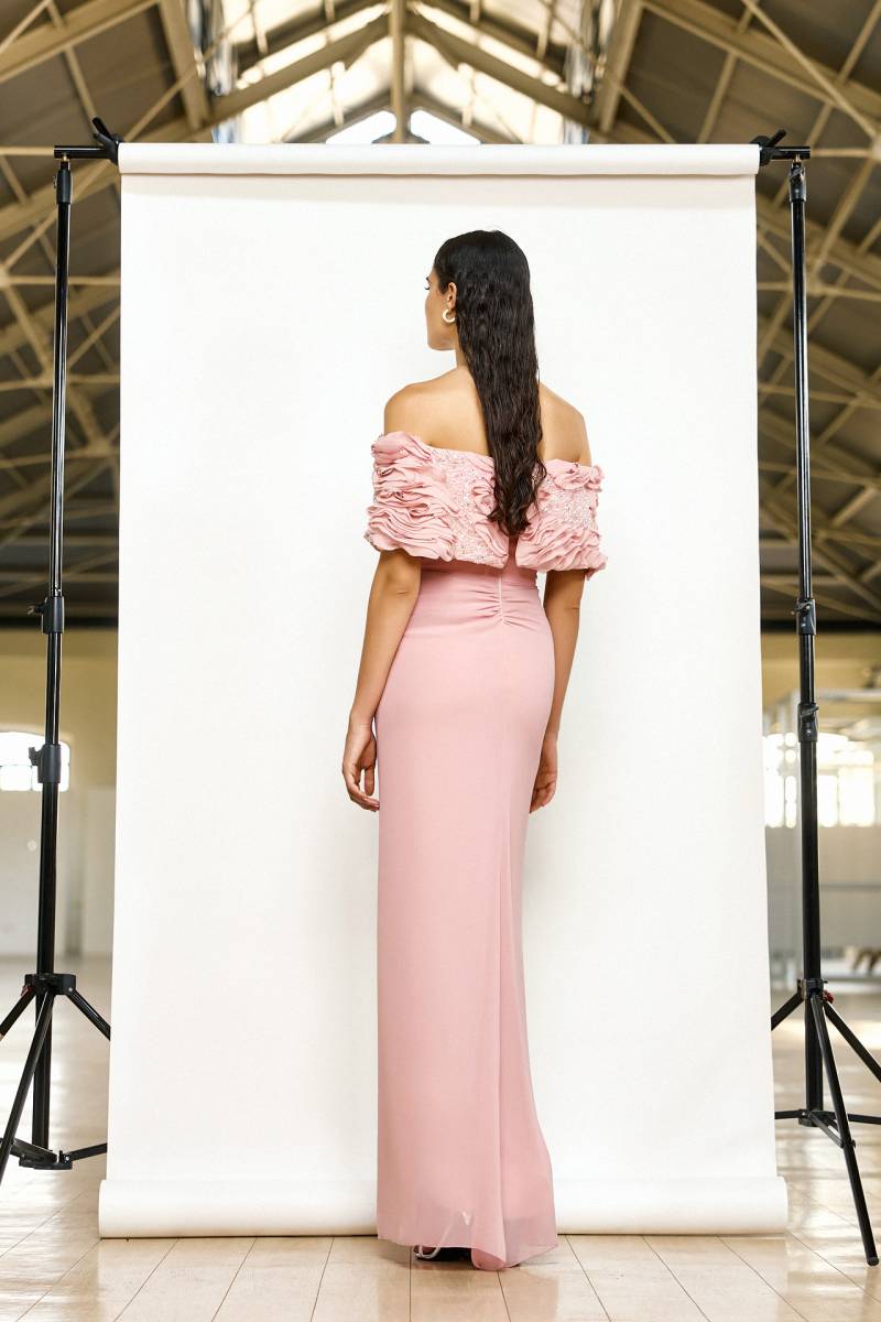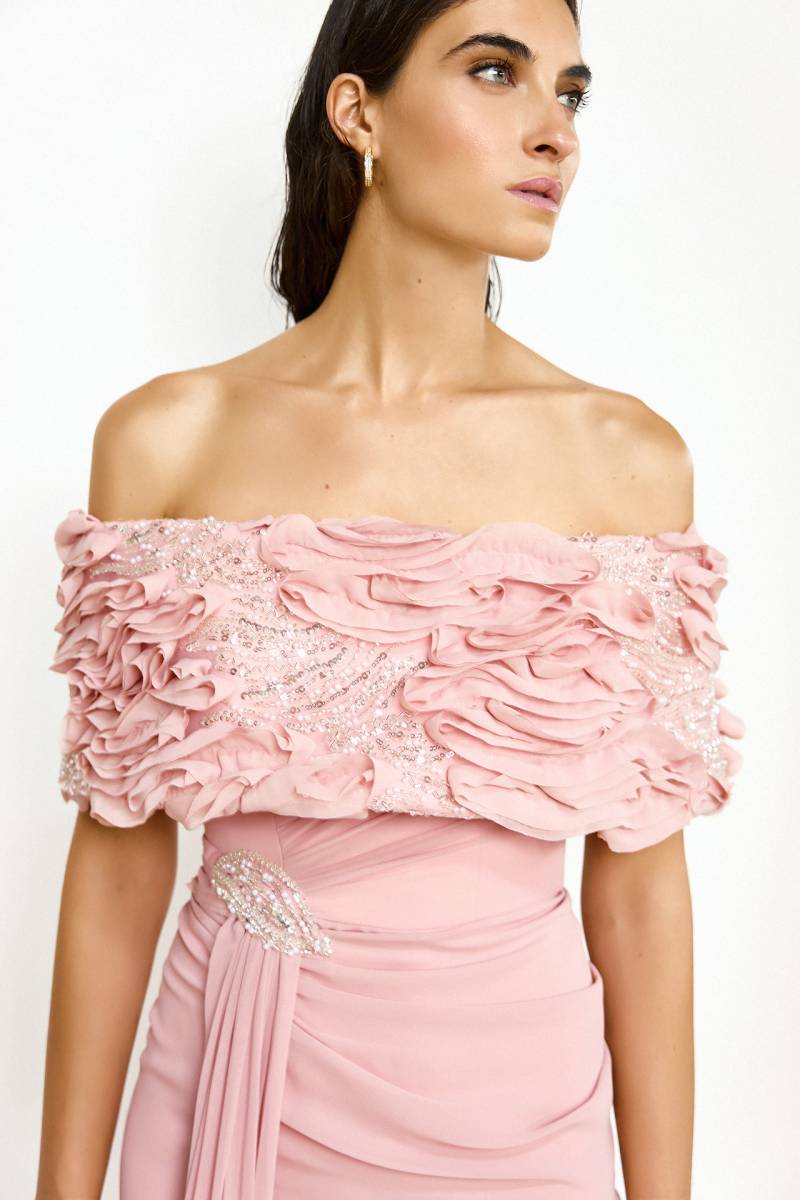Votre fille ou votre fils se marie prochainement ? Cette merveilleuse robe longue de cérémonie sera parfaite pour cet événement. Le bustier bateau dégage le buste et apporte un port de tête altier, il couvre aussi le haut des bras et une étole assorti complètera votre look pour la partie cérémonie. Le bas de la robe de soirée est drapé orné d'un bijou en perles.