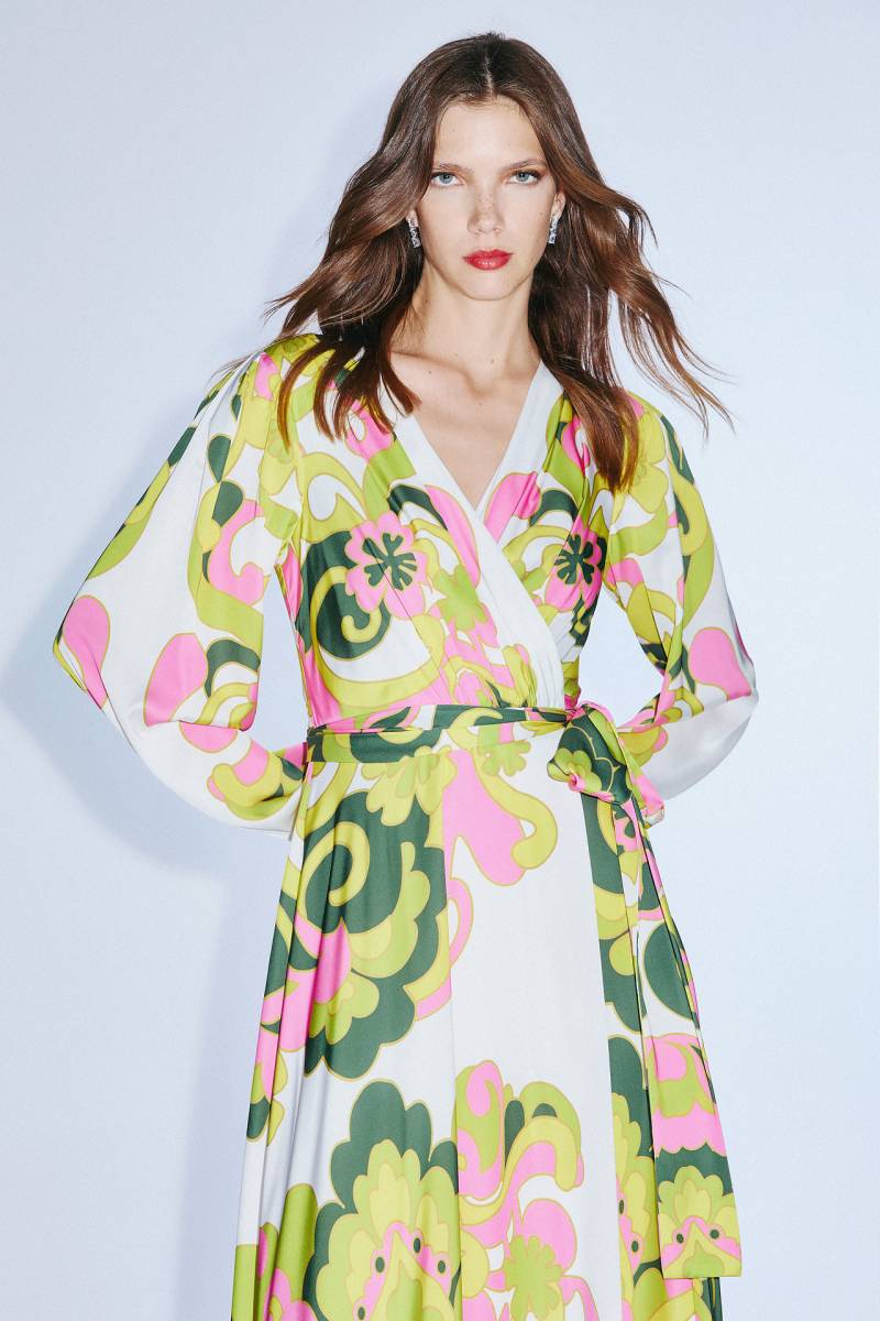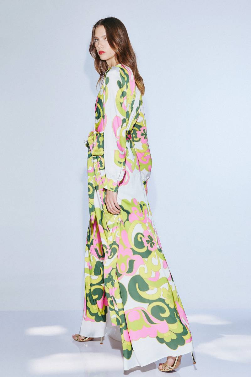 L'imprimé rose et vert, à la fois frais et lumineux, apporte une touche romantique et moderne, parfaite pour une tenue de cérémonie habillée.