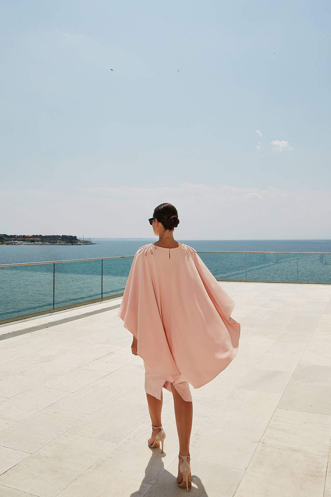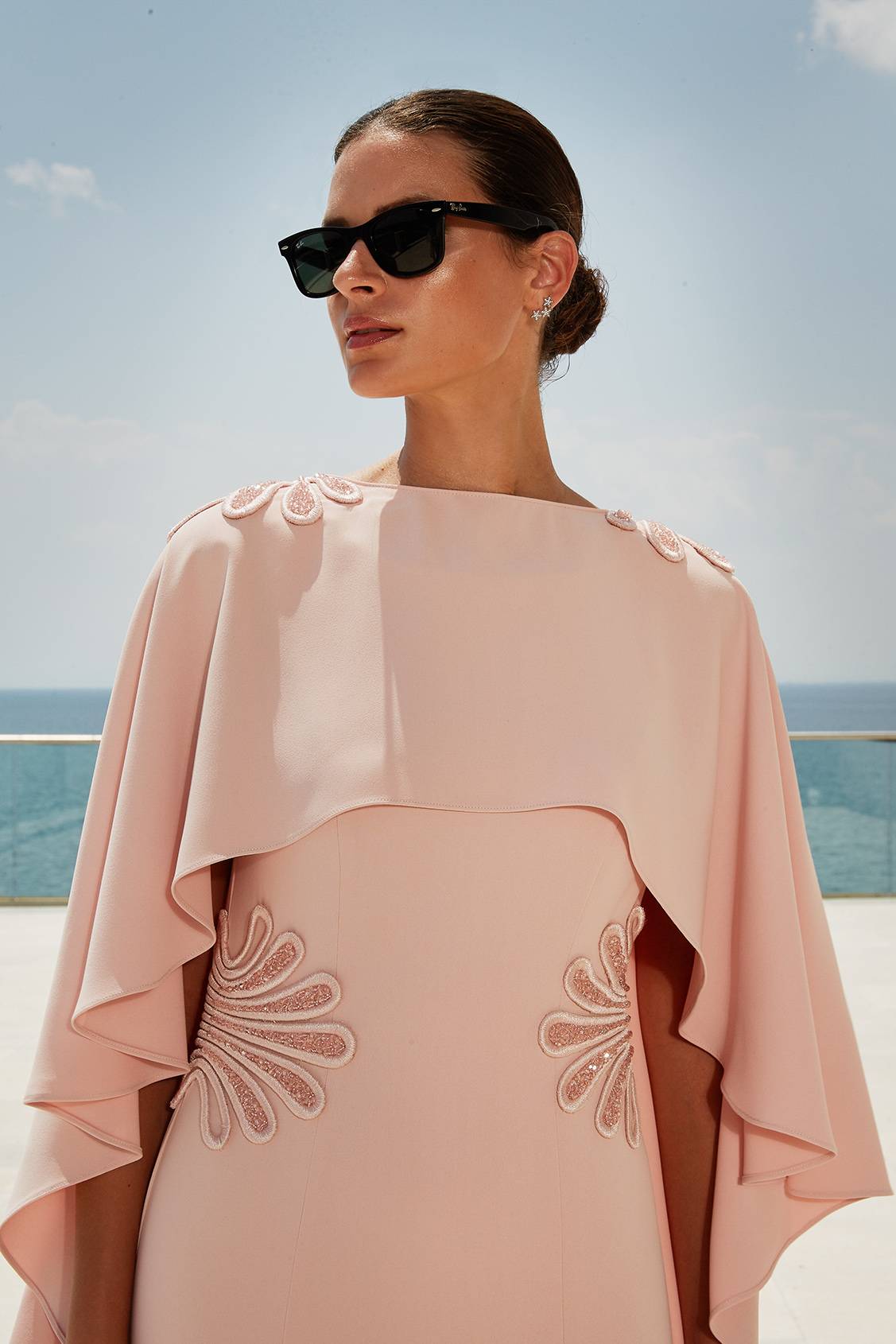 Cette robe en crêpe droite longueur genoux avec sa cape assortie vous fera craquer dessuite .