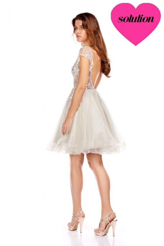 décolleté transparent en V et dos nu , fleurs brodées sur le buste