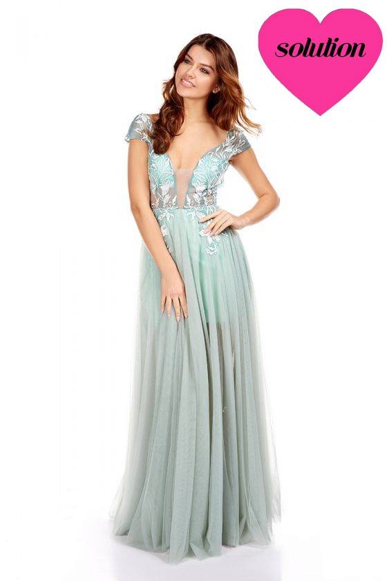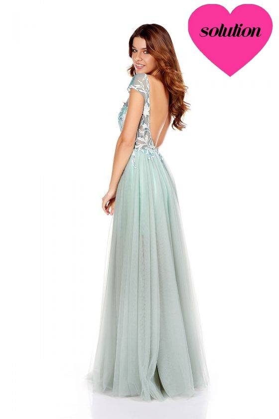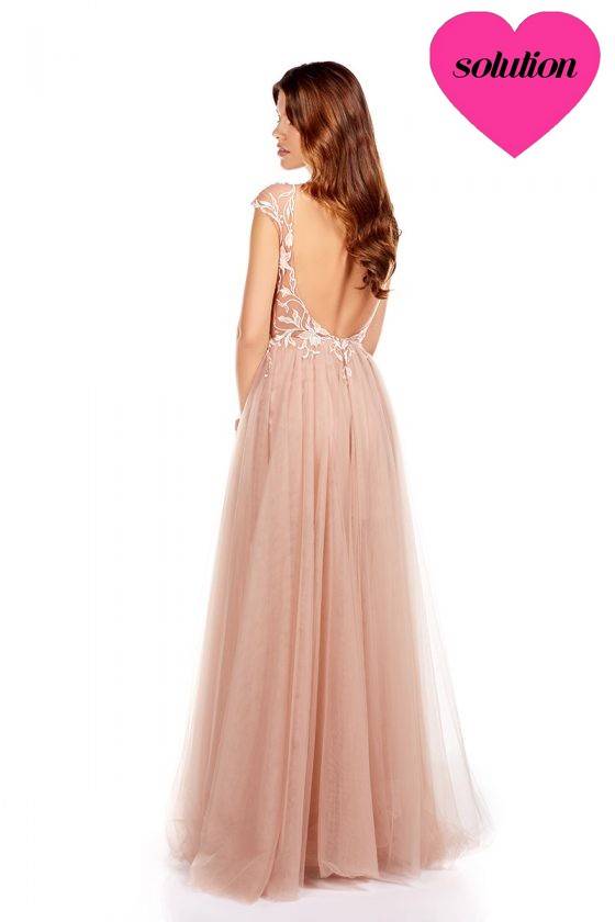 décolleté transparent en V et dos nu , fleurs brodées sur le buste