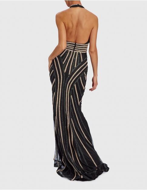 Cette superbe robe noire longue est ornée de strass diamants de la tête aux pieds,
