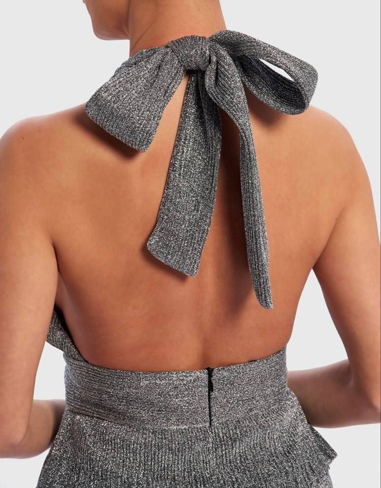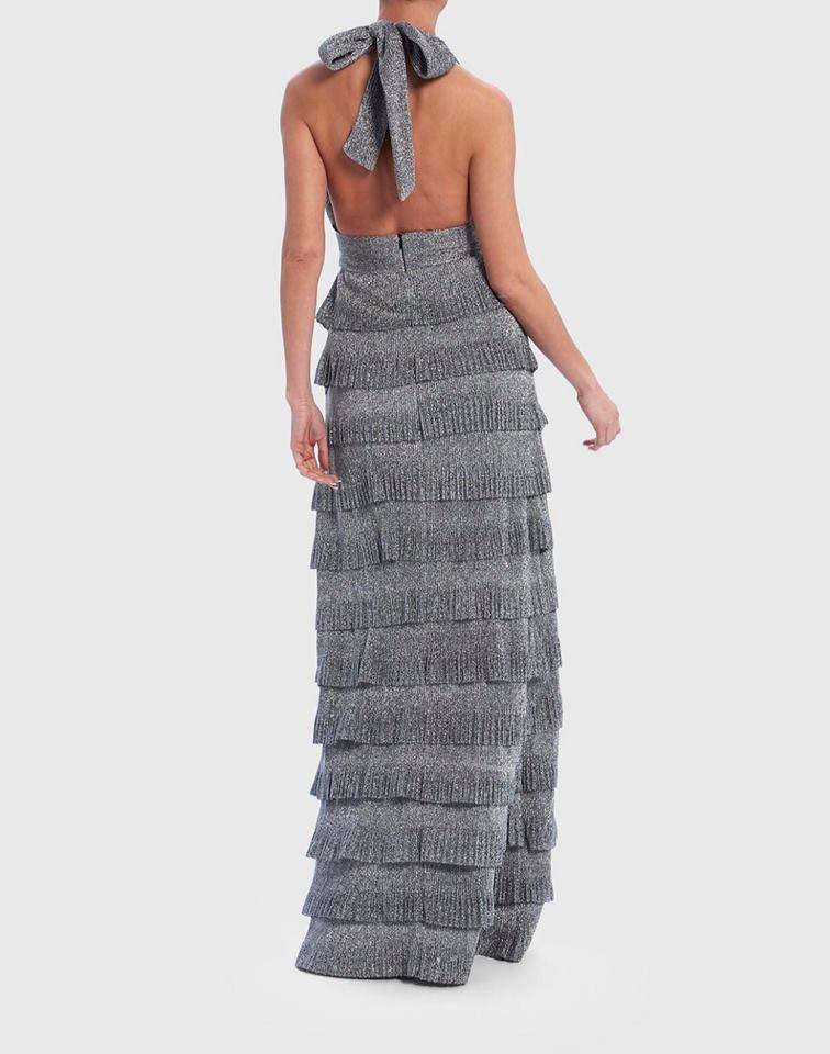 cette robe de soirée est chic et élégante avec une cascade de volants argent en Lurex , excellent maintient au niveau de la poitrine qui s'attache derrière le cou , dos nu et silhouette affinée notamment par sa coupe marquée en taille