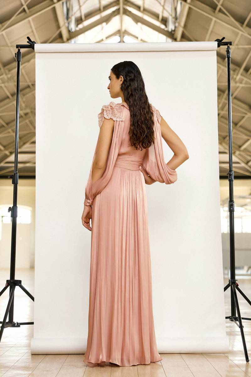 Légère, fluide et féminine, cette robe longue de soirée séduit par sa délicatesse. Son décolleté en V plongeant met en valeur la poitrine. Les épaules sont ornées de deux grosses fleurs en paillettes ton sur ton qui apportent à cette robe de soirée son côté couture italienne. Les manches longues en voile plissée vous couvriront les bras tout en les dévoilant avec subtilité. La taille est marquée par une ceinture, le bas de la robe est fluide avec une fente sur la jambe, beaucoup de confort et de glamour.