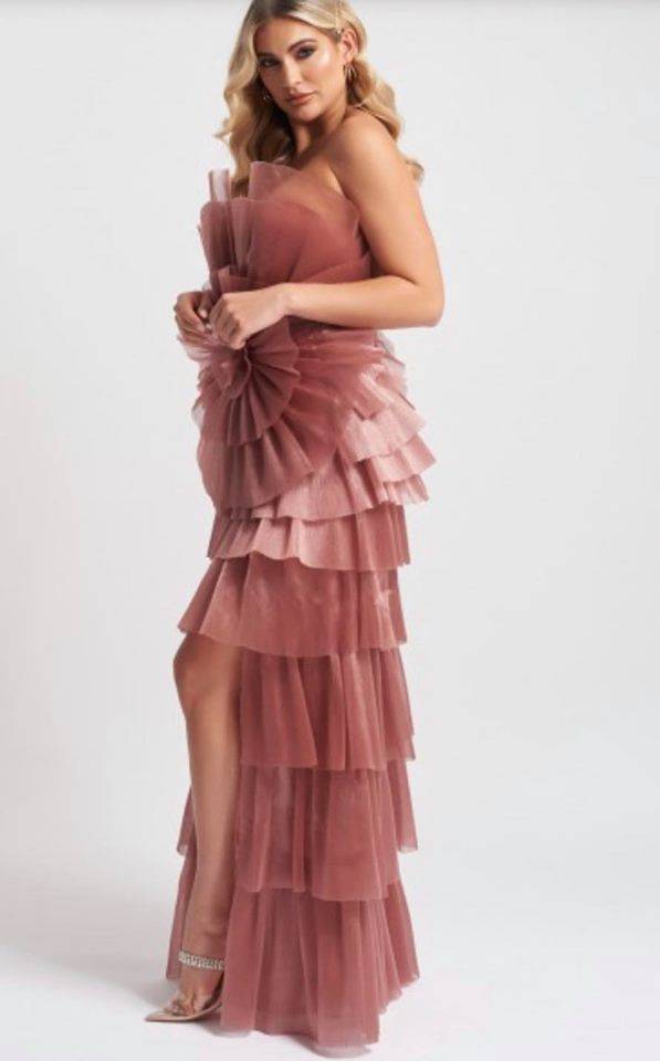 La robe de soirée BLUSH est une robe longue de soirée asymétrique , bustier décolleté en V , avec une fleur de tulle sur la taille et un effet de cascade sur l’arrière avec fente sur la jambe
