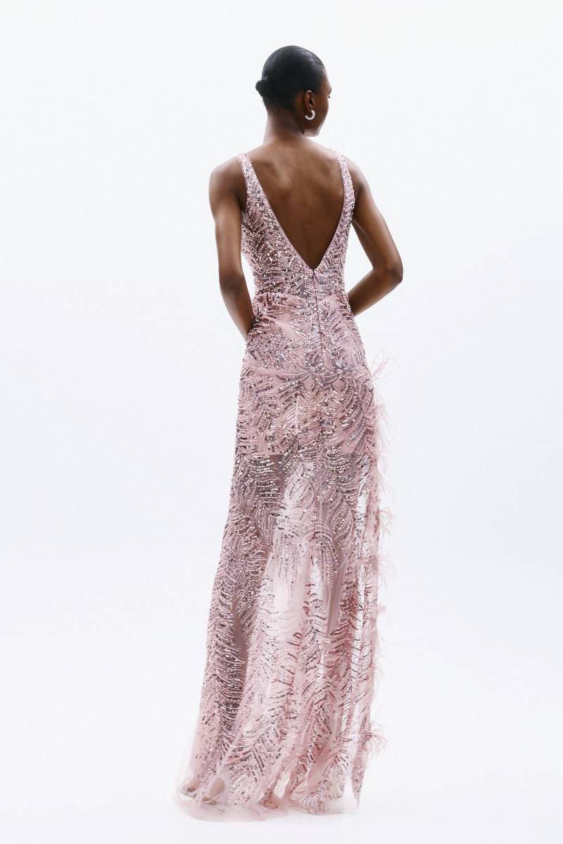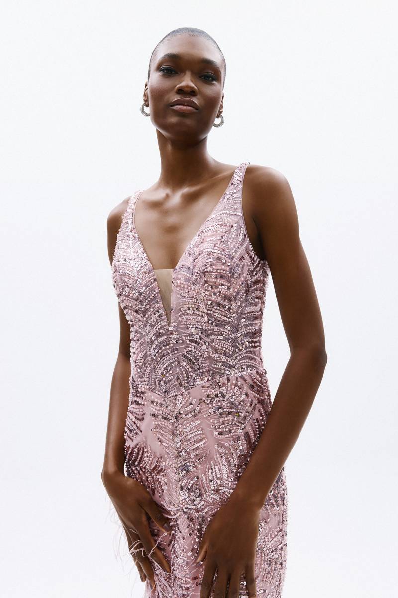 Cette robe prés du corps en paillettes se démarque par son originalité avec sa touche féminine, la fente haute sur la jambe gansé de plumes vous donnera une allure sexy et glamour.