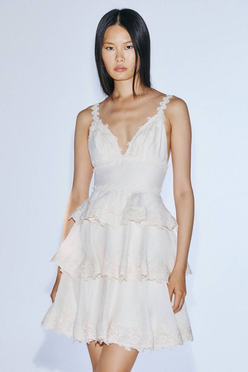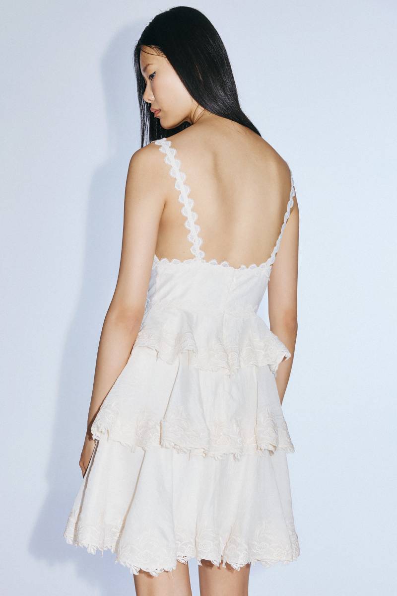 La robe est volantée avec des applications de dentelle, ce qui donne du relief tout en conservant un style naturel et élégant.