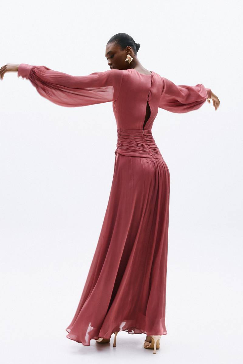 Cette robe longue en mousseline fluide séduit par sa coupe élégante et aérienne, parfaite pour une cérémonie, un mariage bohème chic ou une réception élégante.