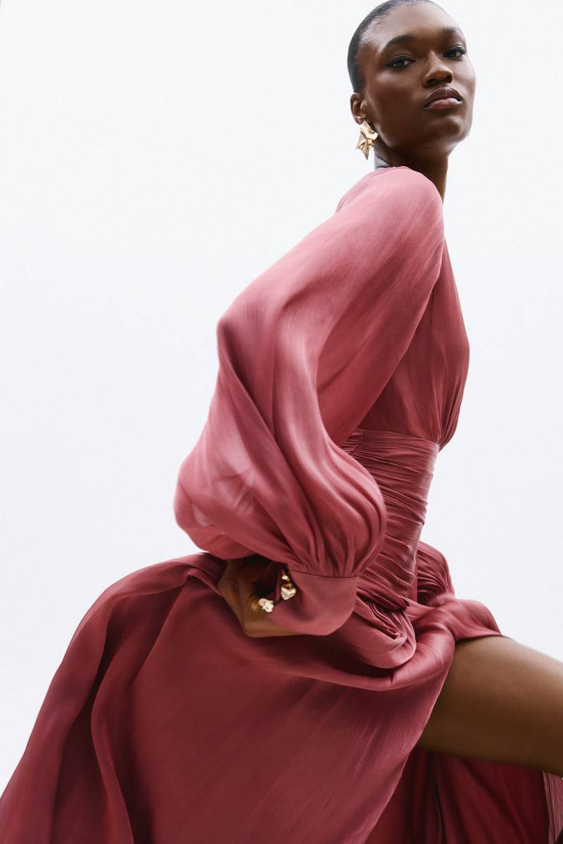 La taille est soulignée par un effet drapé, qui affine visuellement la taille et met en valeur la silhouette avec subtilité.