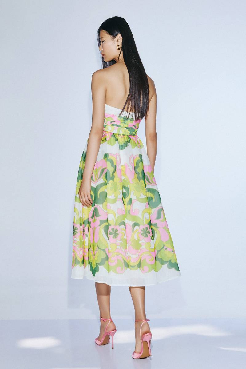 Inspirée par la douceur de vivre italienne et les paysages ensoleillés de la campagne méditerranéenne, cette robe bustier midi de cérémonie est une invitation à l'élégance naturelle. Parfaite pour une invitée de mariage champêtre bohème, elle est à la fois féminine, raffinée et colorée.